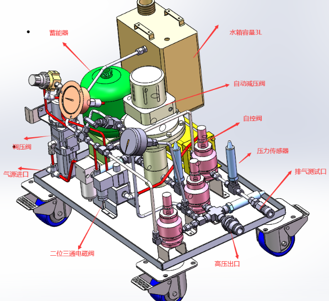 1:整個測試裝置采用模塊化疊加式設(shè)計方案,每個功能模塊相對獨立,功能模塊之間采用快速接頭連接,方便拆裝和運輸。